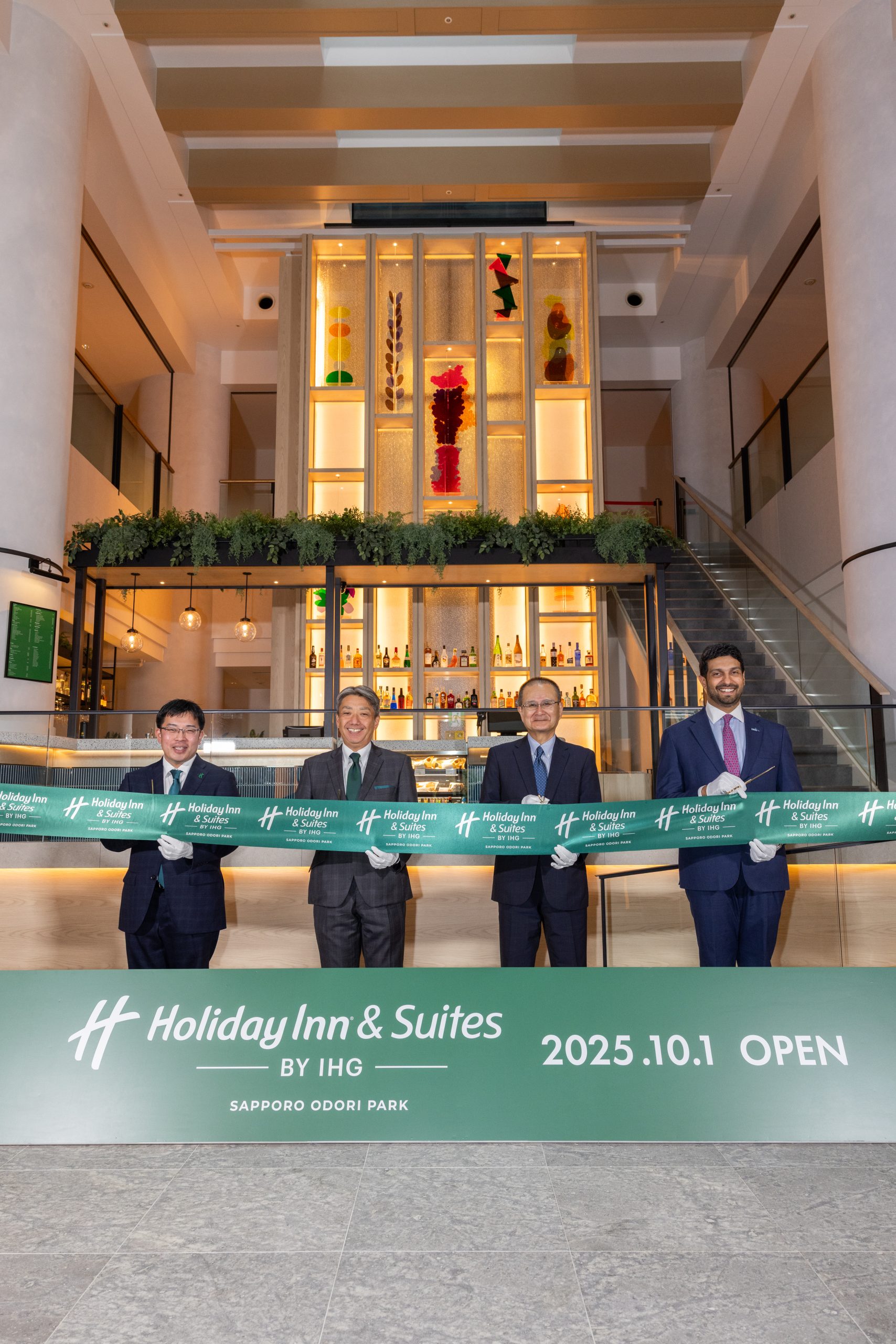 外資系ホテル「ホリデイ・イン&スイーツ札幌大通公園」(札幌市中央区南2条西8丁目6-1)が、2025年10月1日開業した。「ホテルレオパレス札幌」を承継した「テンザホテル&スカイスパ・札幌セントラル」が、同年3月28日に閉館したことを受け、居抜きリニューアル開業した。(写真は、関係者によるテープカット)