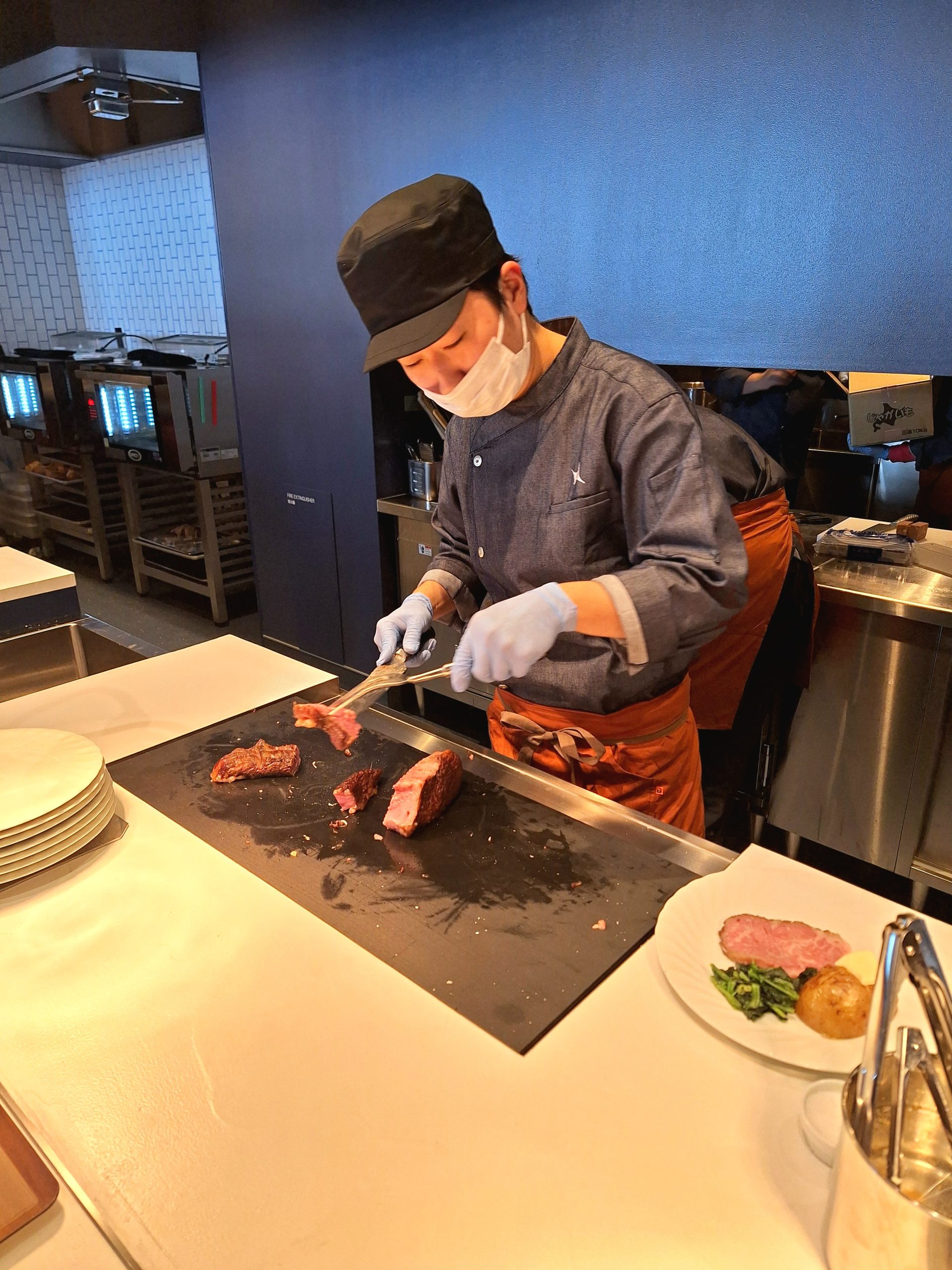 (写真は、「NEST813」で提供されている和牛ローストビーフのカット風景)