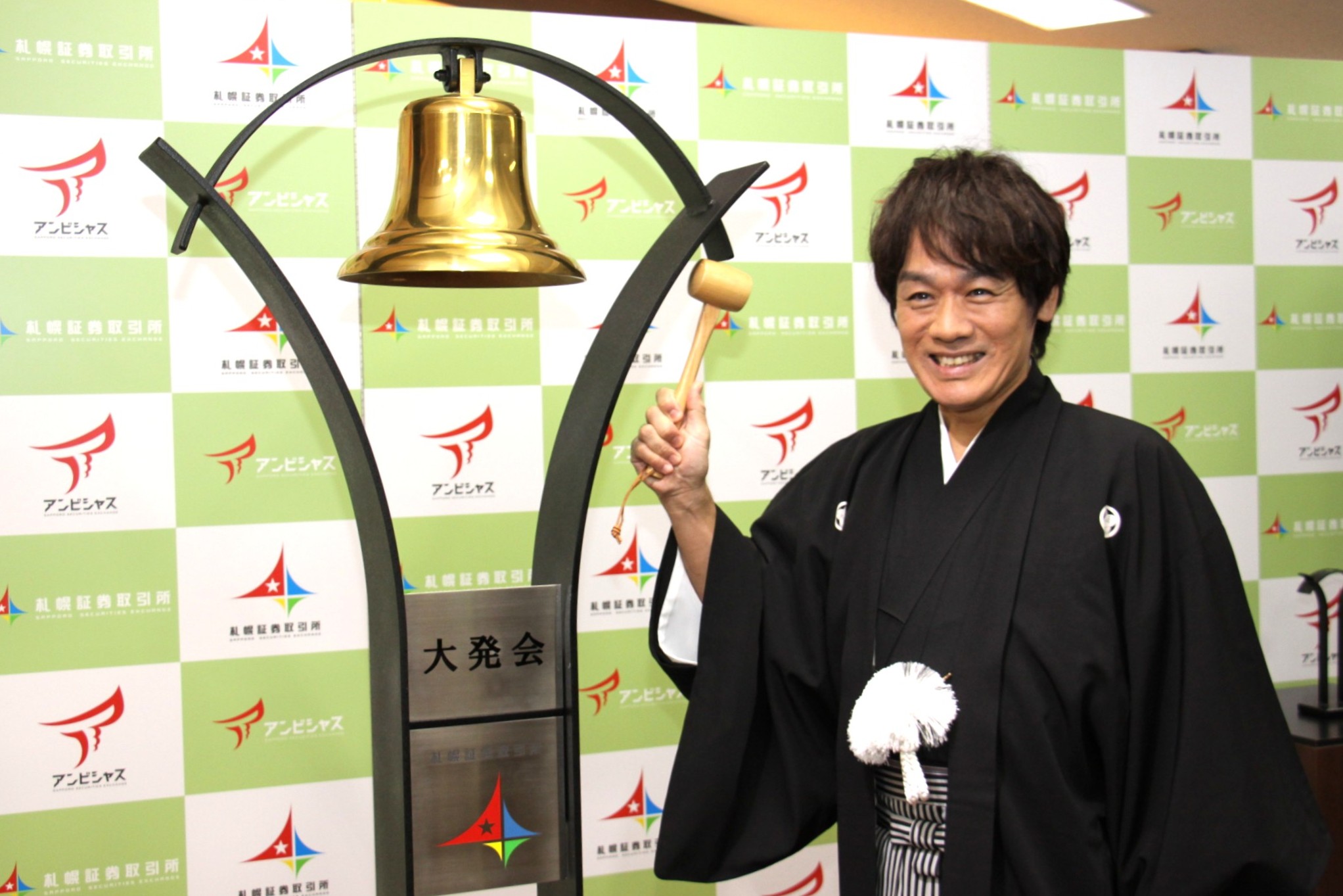 (写真は、札証の鐘を鳴らした森崎博之さんと晴れ着姿の証券関係者)