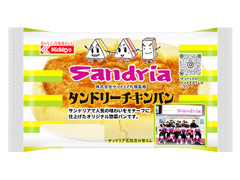 「タンドリーチキンパン」は、ふんわり白生地に、ほぐした蒸し鶏とスパイスがきいたフィリングのタンドリーチキンを練りこんだパン。1個当たり301Kcal。道内のスーパーやコンビニなどで販売しており、価格は2品とも118円(イオンの場合)。パッケージには、「サンドリア」のオリジナルロゴなどが使用され、「やわらかパンにジューシーロング 明太マヨポテト」には本店の従業員、「タンドリーチキンパン」には屯田店の従業員の写真も印刷されている。サンドリア札幌の津田哲平社長は、「日糧製パンさんにずっと恩返しがしたかったが、今回ようやく実現した。これからもこうした監修商品の展開を考えていきたい」と話している。