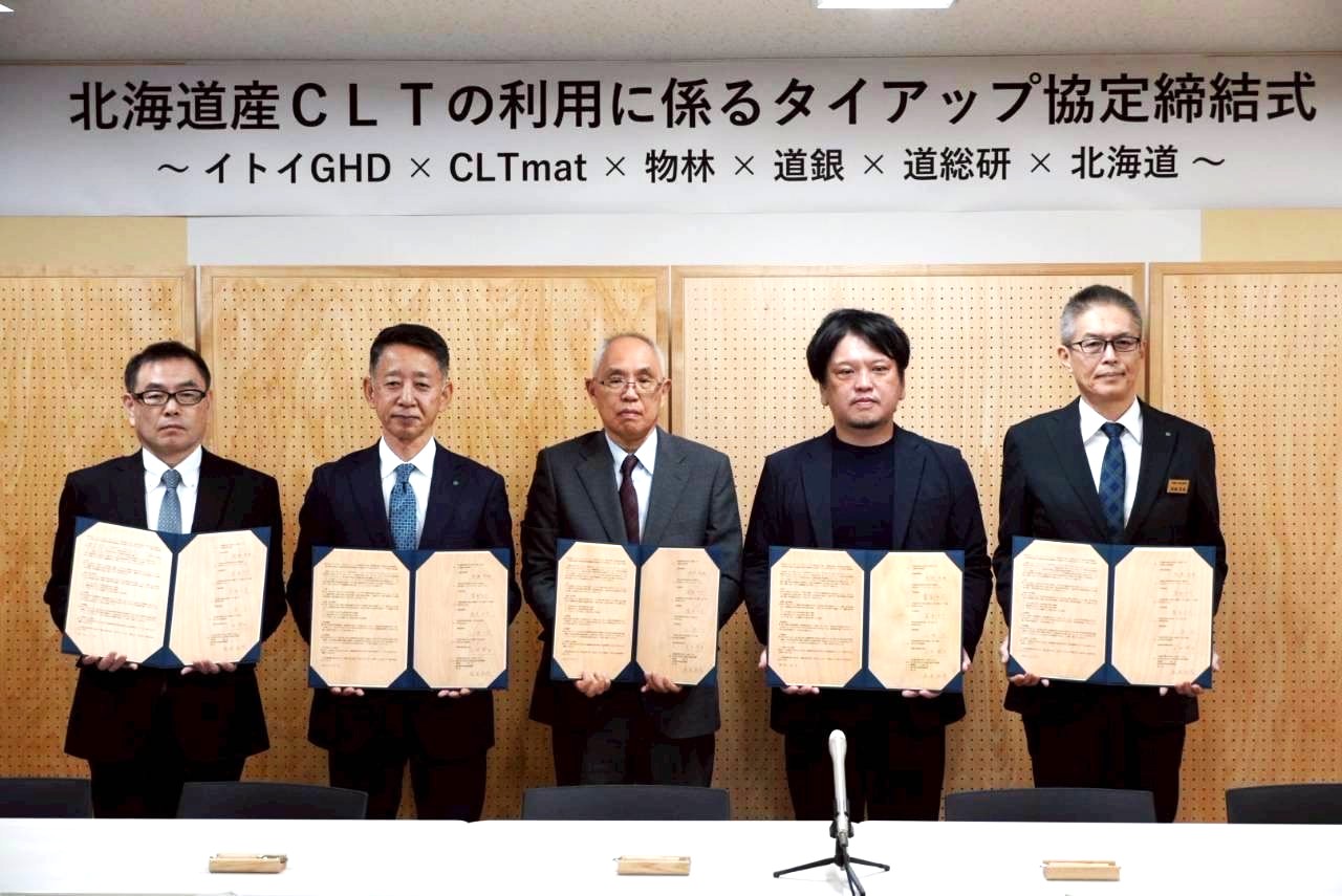 イトイグループホールディングス(GHD、本社・士別市)、CLTmat(同・札幌市中央区)、物林(同・東京都江東区)、北海道銀行(本店・同)、地方独立行政法人北海道総合研究機構、北海道の6者は、2026年2月9日、道産CLT(直交集成材)の利用が進むように、相互に連携・協力しながら協働事業に取り組むタイアップ協定を締結した。