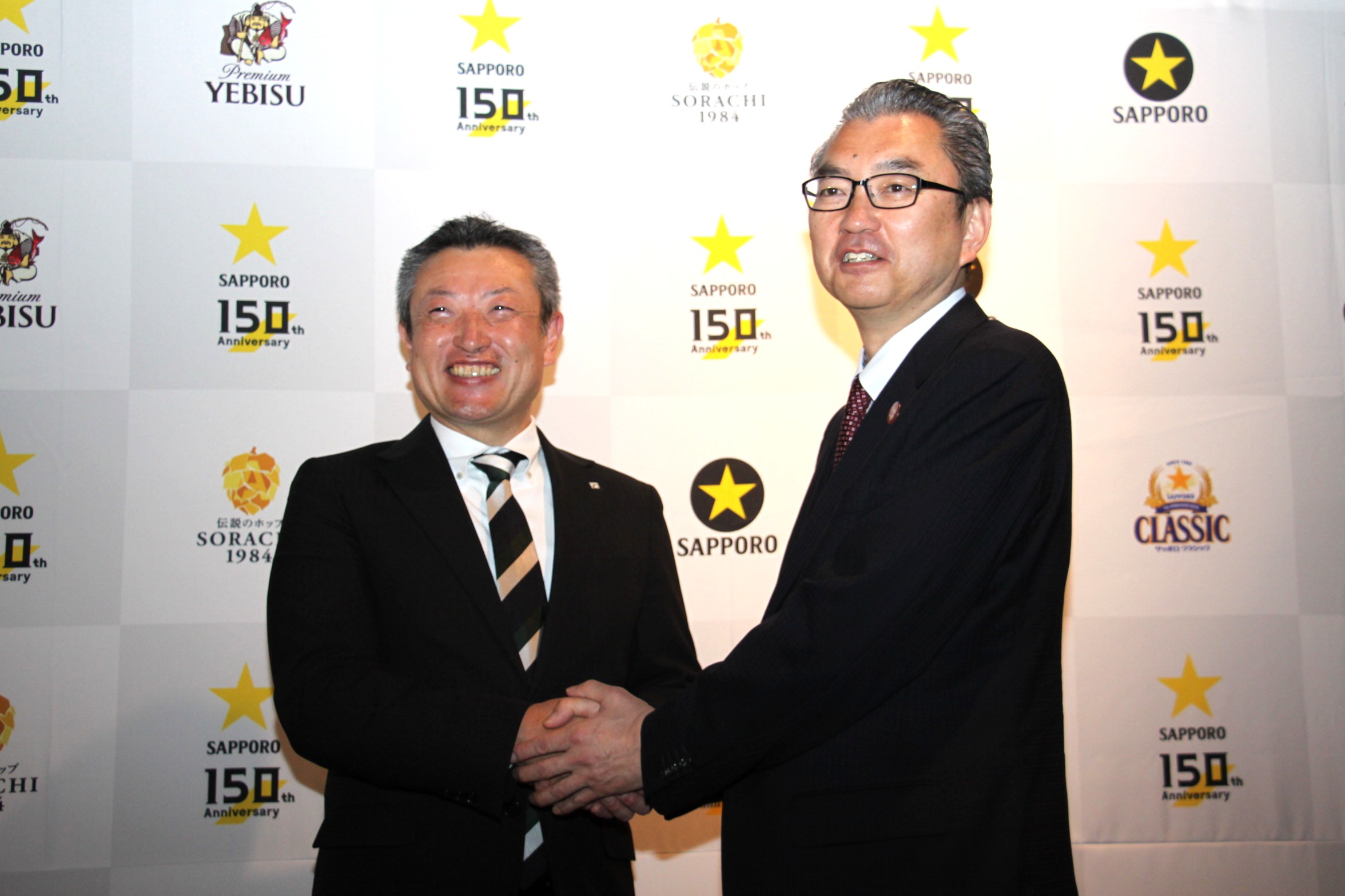 (写真は、体験型ふるさと納税を発表するサッポロビール・牧野成寿上席執行役員北海道本部長=左と札幌市・加藤修副市長。2026年4月27日サッポロビール博物館3階プレミアムシアターにて)