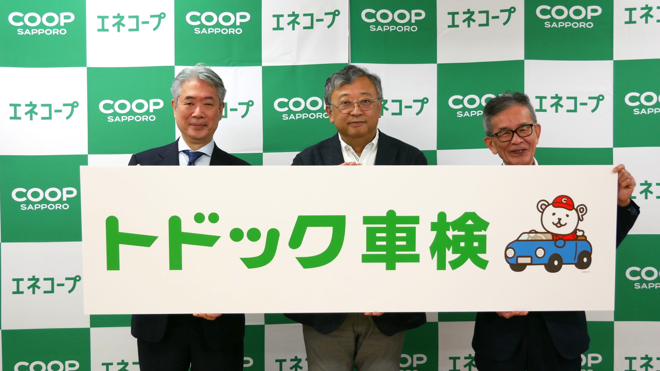 コープさっぽろ(本部・札幌市西区)の関連会社で、灯油配達や廃車買い取りサービスを行っているエネコープ(本社・同市中央区)は、ナルネットコミュニケーションズ(同・愛知県春日井市)と提携、新サービスとして「トドック車検」を2025年9月29日から開始した。(写真は、「トドック車検」の会見。左からナルネットコミュニケーションズ・鈴木隆志社長、コープさっぽろ・大見英明理事長、エネコープ・五十里浩輔社長=コープさっぽろ提供)