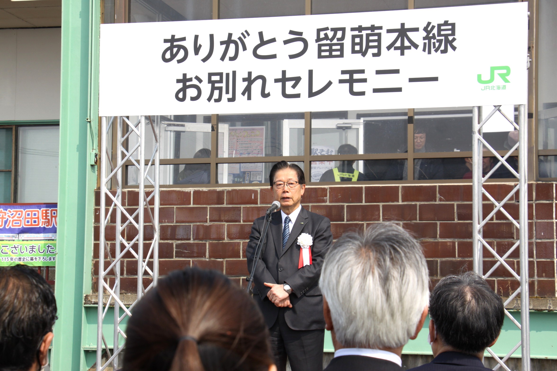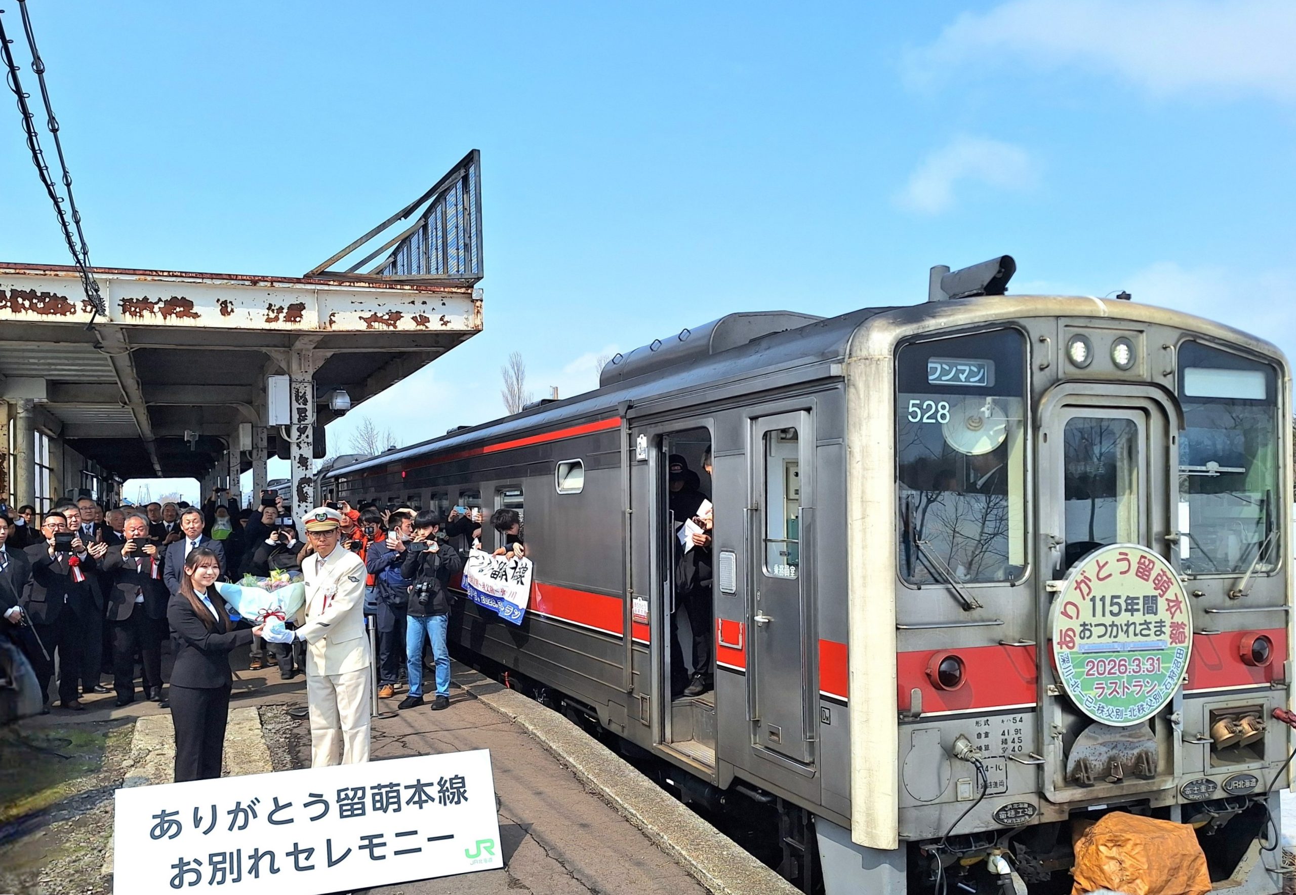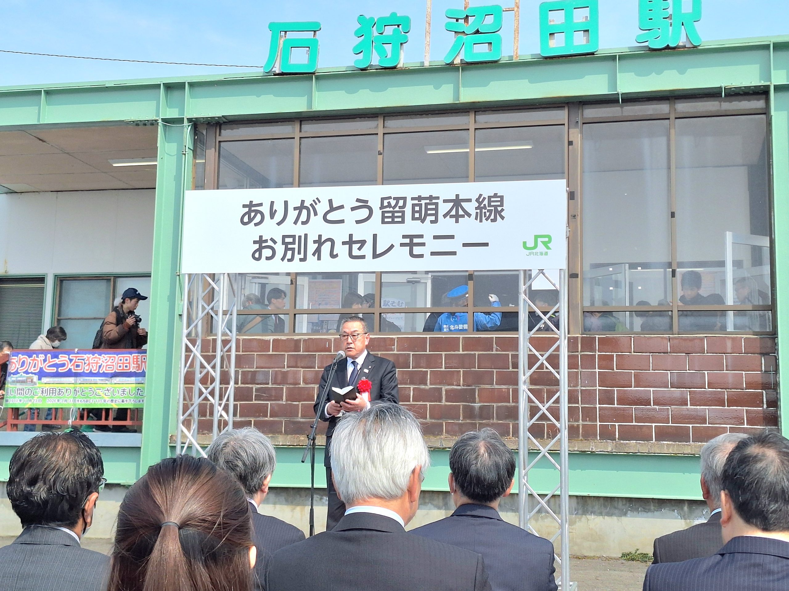 最終運行日のこの日、石狩沼田駅、秩父別駅、深川駅でそれぞれ時間をずらしてお別れセレモニーが開催された。石狩沼田駅では、同日11時から駅前の特設会場でセレモニーが行われ、町の関係者や住民など大勢の人たちが集まった。最初に、JR北海道の島田修会長が登壇。島田氏は、少し甲高い声で、「28年前、NHK連続テレビ小説『すずらん』の撮影が当地をロケ地として始まるということで、沼田町を訪れたのが、私と町との最初の出会いだった。撮影協力のためにSLを復元、結果的に留萌線で8年間運行を続けるなど、沼田町の皆さんには大変な協力をいただいた。明日からはバス運行が始まるが、公共交通として高校の通学に支障がでないように準備させていただいた。地域の皆さまに利用いただけるようにお願いしたい」と挨拶した上で、「115年間ありがとうございました」と頭を下げた。