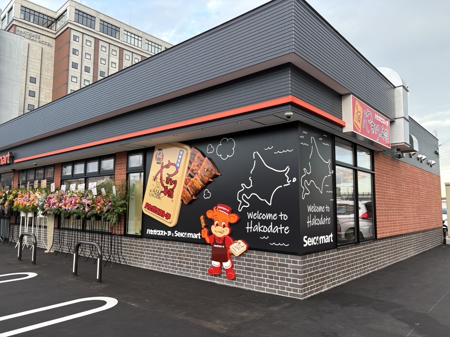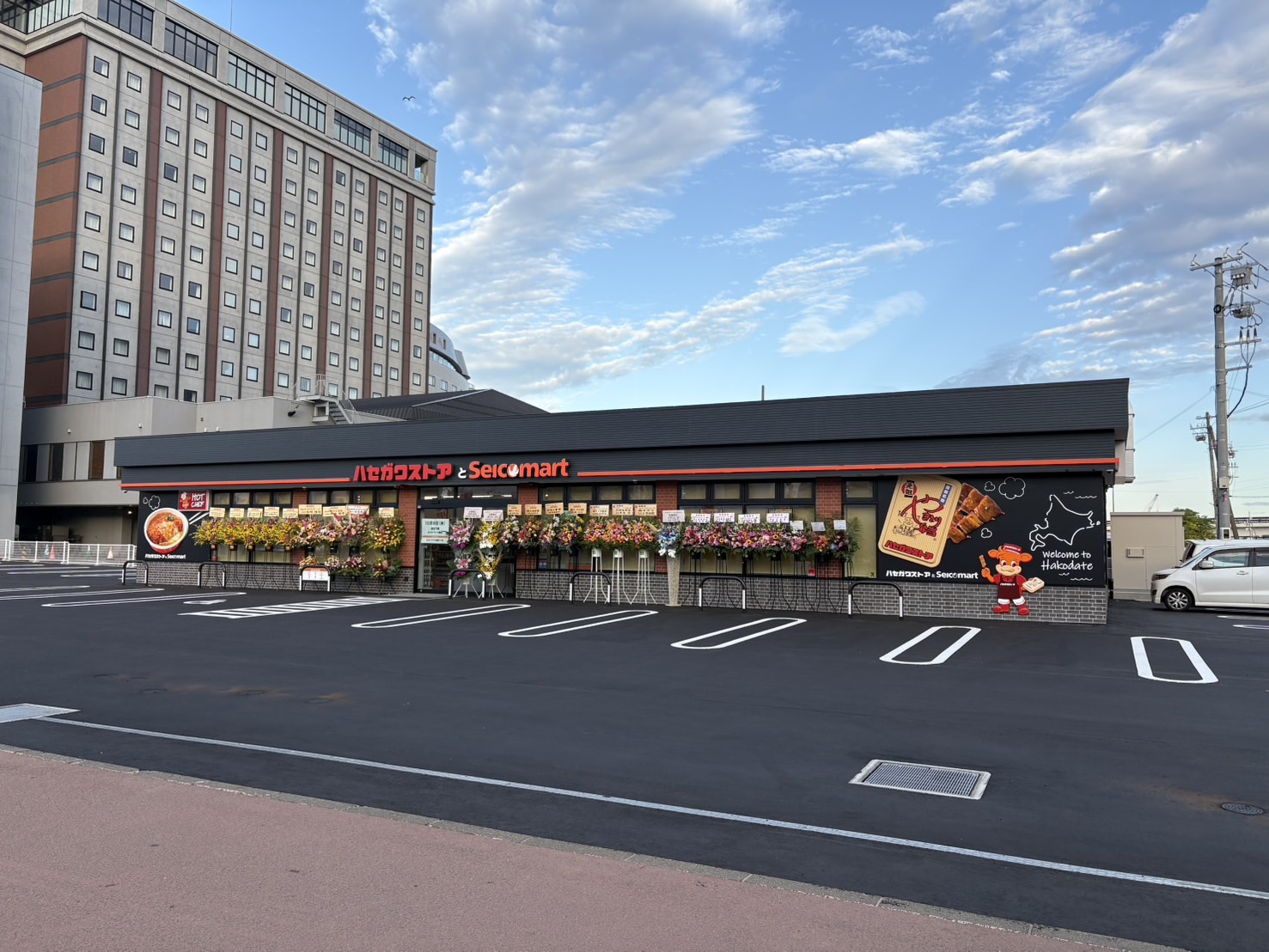 セコマ(本社・札幌市中央区)グループのセイコーマート(同・同)は、同じグループのハセガワストア(同・函館市)が函館圏で展開している「ハセガワストア」を併設した「セイコーマート函館ベイ店」(函館市大手町5-9)を、2025年10月9日にオープンさせた。両ブランドのコラボ店舗は初めて。ご当地カラーの強い2ブランドが合体するという、異色の組み合わせとなっている。(写真は、「ハセガワストア」とのコラボ店舗「セイコーマート函館ベイ店」=写真は、いずれもセコマ提供)