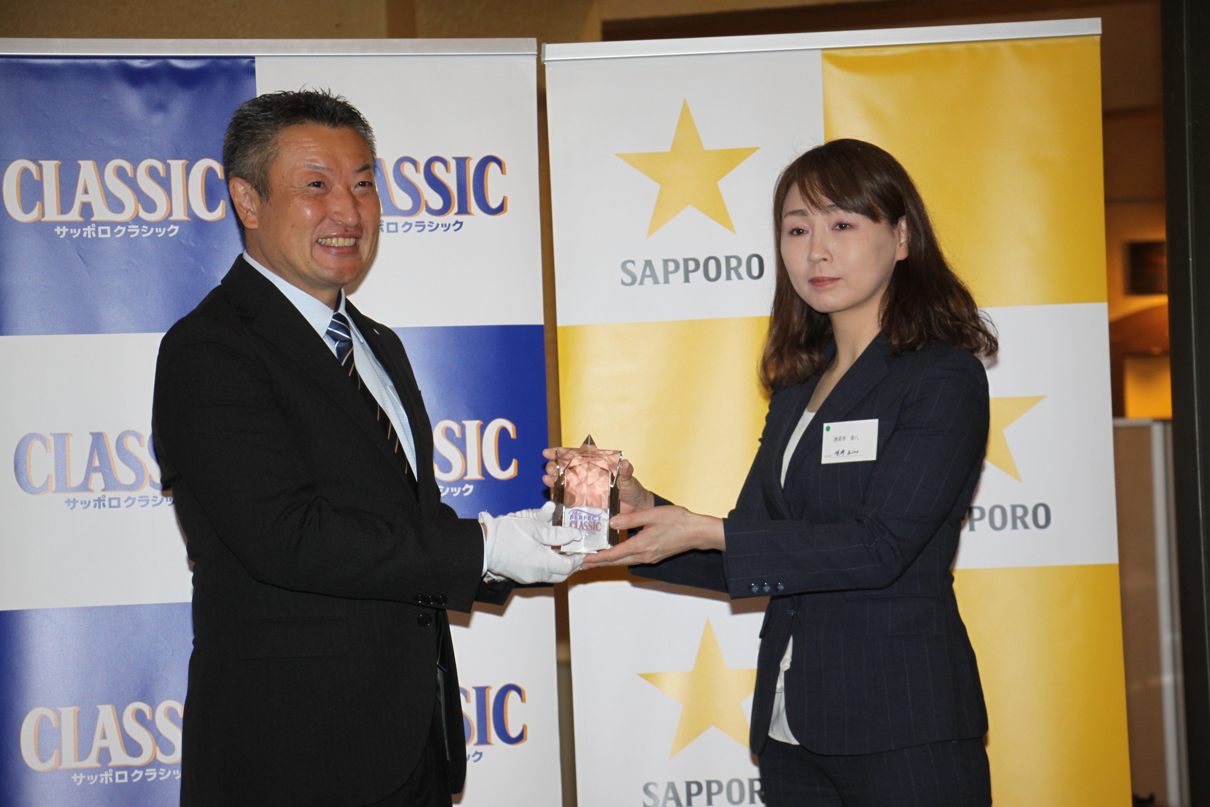 (写真は、サッポロビール北海道本部の牧野成寿上席執行役員本部長から「ベスト オブ パーフェクトクラシック2025」のトロフィーを授与される網走市の酒菜亭「喜八」関係者)