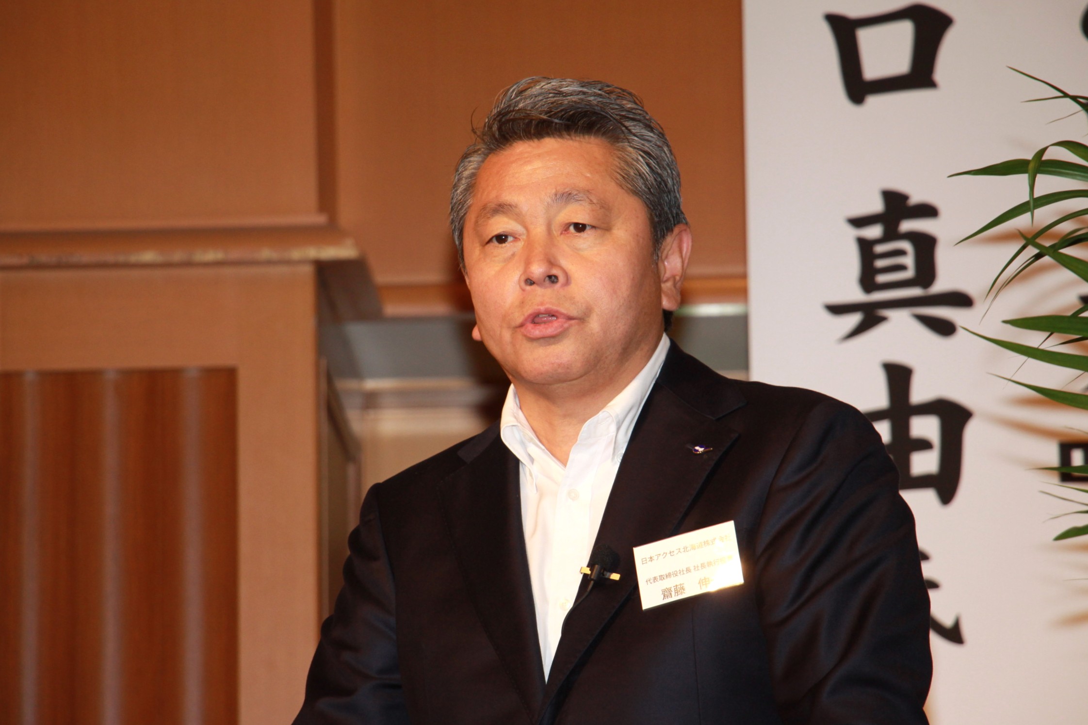 日本アクセス北海道(本社・札幌市東区)は、2025年11月21日、札幌市中央区の札幌パークホテルで「2025年度北海道アクセス会フォーラム」を開催した。その中で、日本アクセス北海道の齋藤伸一社長は、同社の2025年度上期決算を報告、売上高は、前年同期比1・1%増の531億3800万円になったことを示した。(写真は、2025年度上期決算を報告する日本アクセス北海道の齋藤伸一社長)
