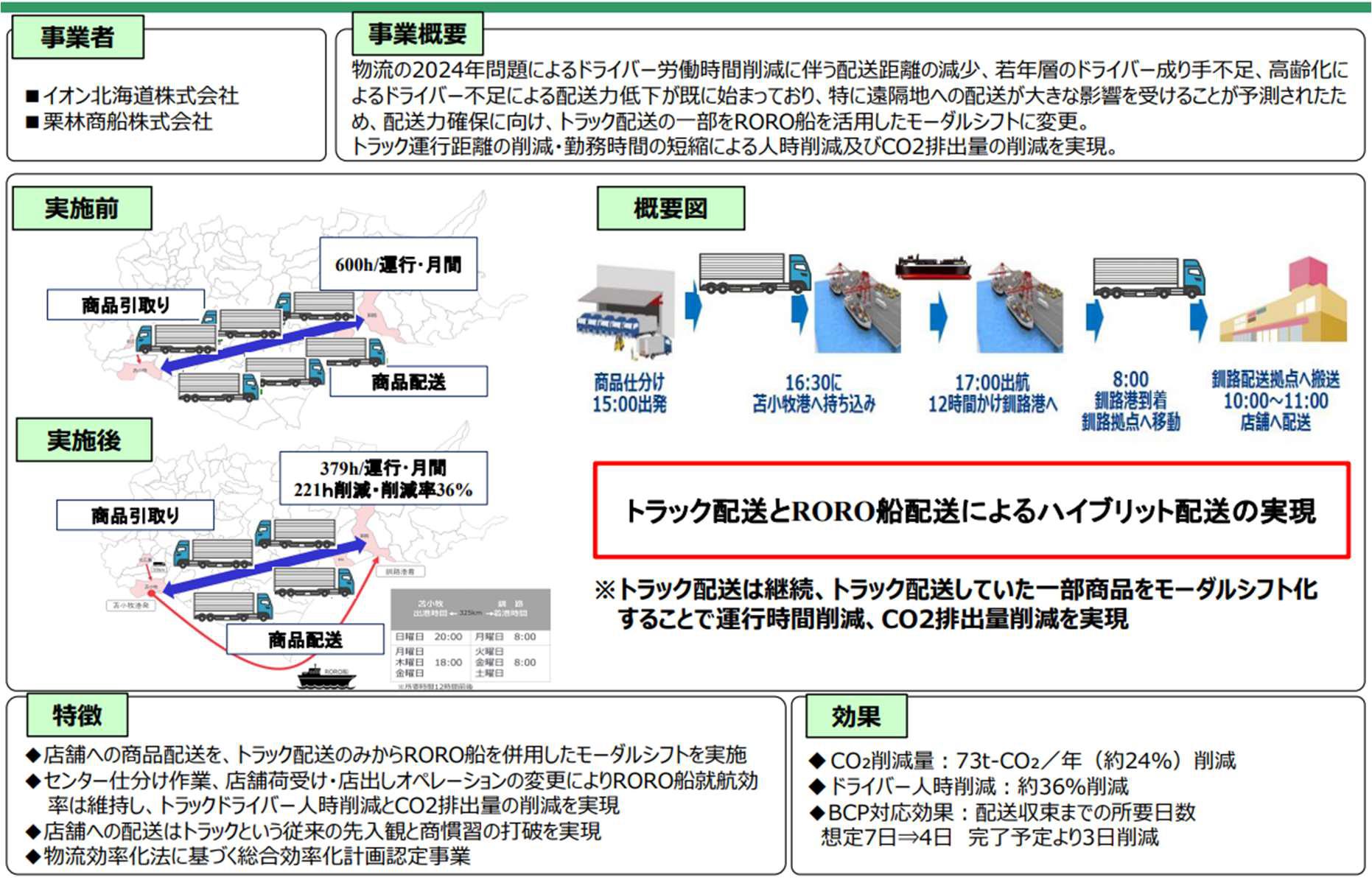 イオン北海道は、2024年5月、栗林商船(本社・東京都千代田区)と共同で、苫小牧港と釧路港を結ぶ「RORO船を活用したモーダルシフト」の実証実験を開始。2025年7月に対象店舗数を拡大して本格実施に入った。現在では、衣料品や食料品の一部を週4回、トラックとRORO船のハイブリッド型で配送、トラックドライバーの人時(1人の作業者が1時間で完了できる作業量)を約36%削減、CO2排出量を約24%削減するなど、取り組みの効果が出ている。今回の「物流パートナーシップ優良事業者表彰」における「強靭・持続可能表彰」は、その取り組みが評価された。