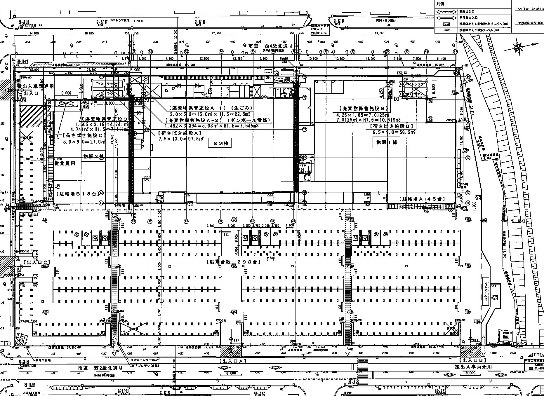 SM(スーパーマーケット)棟は店舗面積約657坪(2169・695㎡)で、コープさっぽろが入る。物販1棟はテナント1(店舗面積約324坪=1071・551㎡)とテナント2(店舗面積約301坪=994・273㎡)、物販2棟はテナント3(店舗面積約314坪=1036・337㎡)で構成。3棟の店舗面積合計は、約1651坪(5449・058㎡)。
