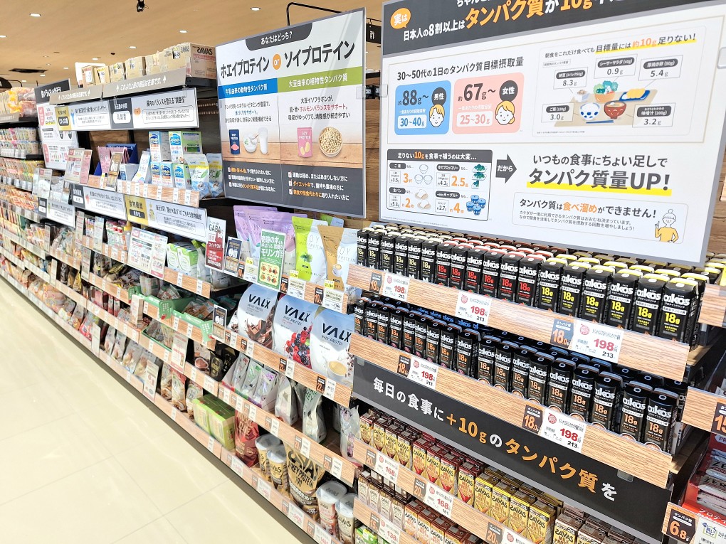 食品売り場でも、3階のフィットネスクラブと連動して、「腸活」「プロテイン」といった提案コーナーを設けた。また、酒コーナーでは、話題のサツドラクラフトチューハイやおつまみのほか、「山崎」「宮城峡」といった高額商品の品揃えも増やした。レジは、フルセルフ6台、セミセルフ2台。サツドラ担当者は、「コスメは百貨店並みのアイテムを揃え、日用品や食品は毎日の生活をサポートできる豊富な品揃えとなっており、地域住民のニーズに応えたい」としている。営業時間は9時~22時。駐車場は30分無料、サツドラ利用で120分間無料になる。