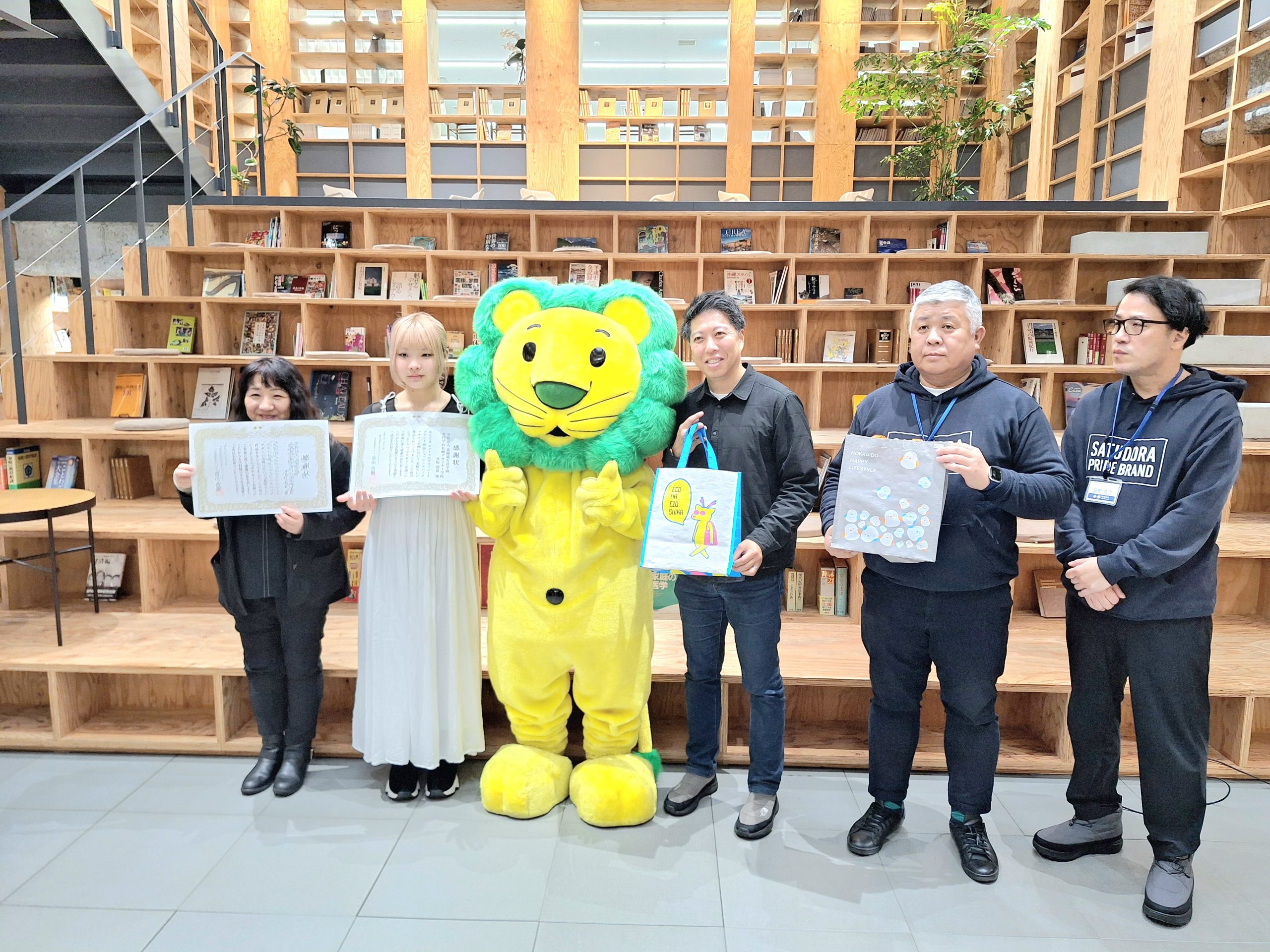 サツドラホールディングス(本社・札幌市東区)のグループ会社、サッポロドラッグストアー(同・同)は、北海道の学生がデザインした「ショッピングバッグ」と「歯ブラシ」をサツドラオリジナル商品として、数量限定でラインナップする。同社は、自社商品に学生デザインを採用する取り組みを定期的に行っており、2026年2月18日には、サツドラ本社2階のBOOK LOUNGEで、今回のデザインを担当した学生4人の表彰式を行った。