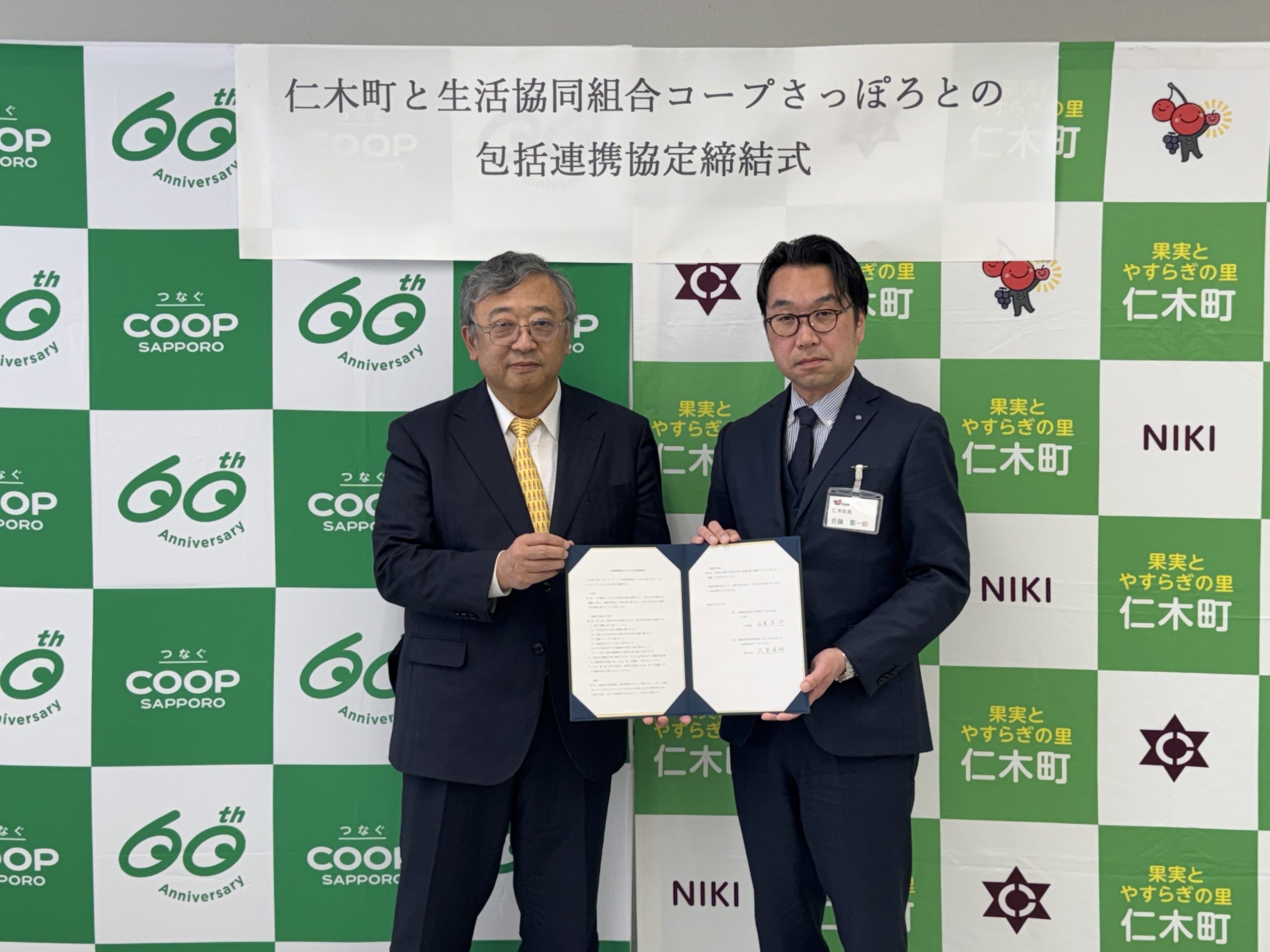 締結式は、2026年2月20日、仁木町役場で仁木町の佐藤聖一郎町長とコープさっぽろの大見英明理事長が出席して行われた。協定の主な内容は、①仁木町の買い物環境に関すること②外国人との共生社会実現に向けた相互支援に関すること③資源リサイクルに関すること④地域住民のサービス向上に関すること⑤両者が有する各種資源の活用と交流に関すること⑥その他、地域の課題解決と活性化に係る協力に関することーーとなっている。
