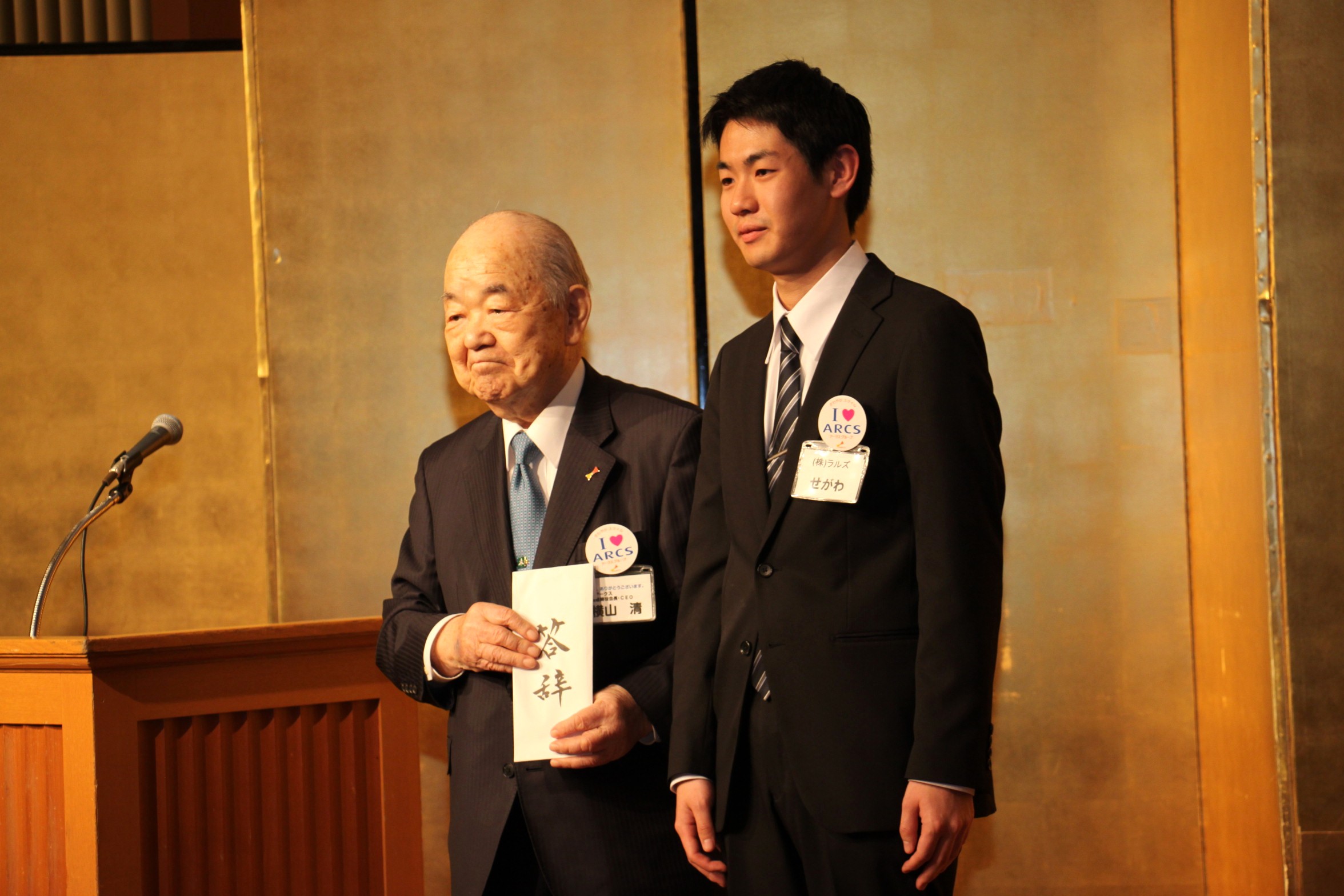 (写真は、新入社員代表のラルズ・瀬川紘叶さんから答辞を受け取る横山会長・CEO)