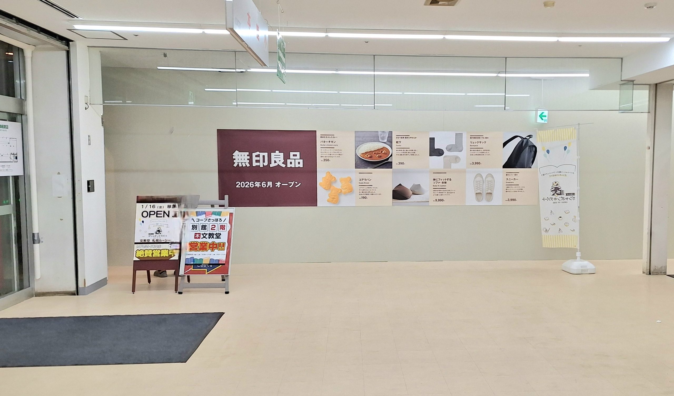 今回の「コープさっぽろルーシー」の出店場所は、別館の1階。ここには、「文教堂札幌ルーシー店」が入っていたが、2026年1月28日に別館2階に移転、空きフロアになった1階部分に居抜き出店する。「無印良品」の道内店舗数は、これによって29店舗となり、「コープさっぽろ」のコラボは12店舗目。コープコラボの店舗比率は41%となり、40%を超える。