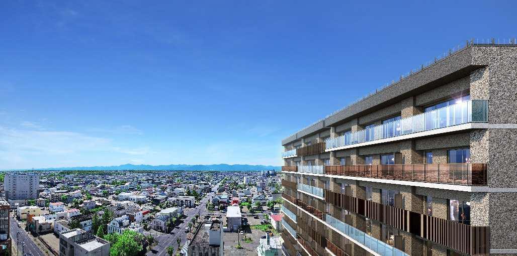 分譲マンション「ミッドレジデンス帯広駅前」は、地上14階建て、全185戸、2LDK~4LDKを中心として住戸構成を予定している。南向き、西向きの住戸配置によって、採光と通風に適した住環境を実現する。西向き上層階からは、日高山脈が一望でき、南向き住戸からは、エリアの広場と十勝晴れの十勝平野の眺望が広がる。