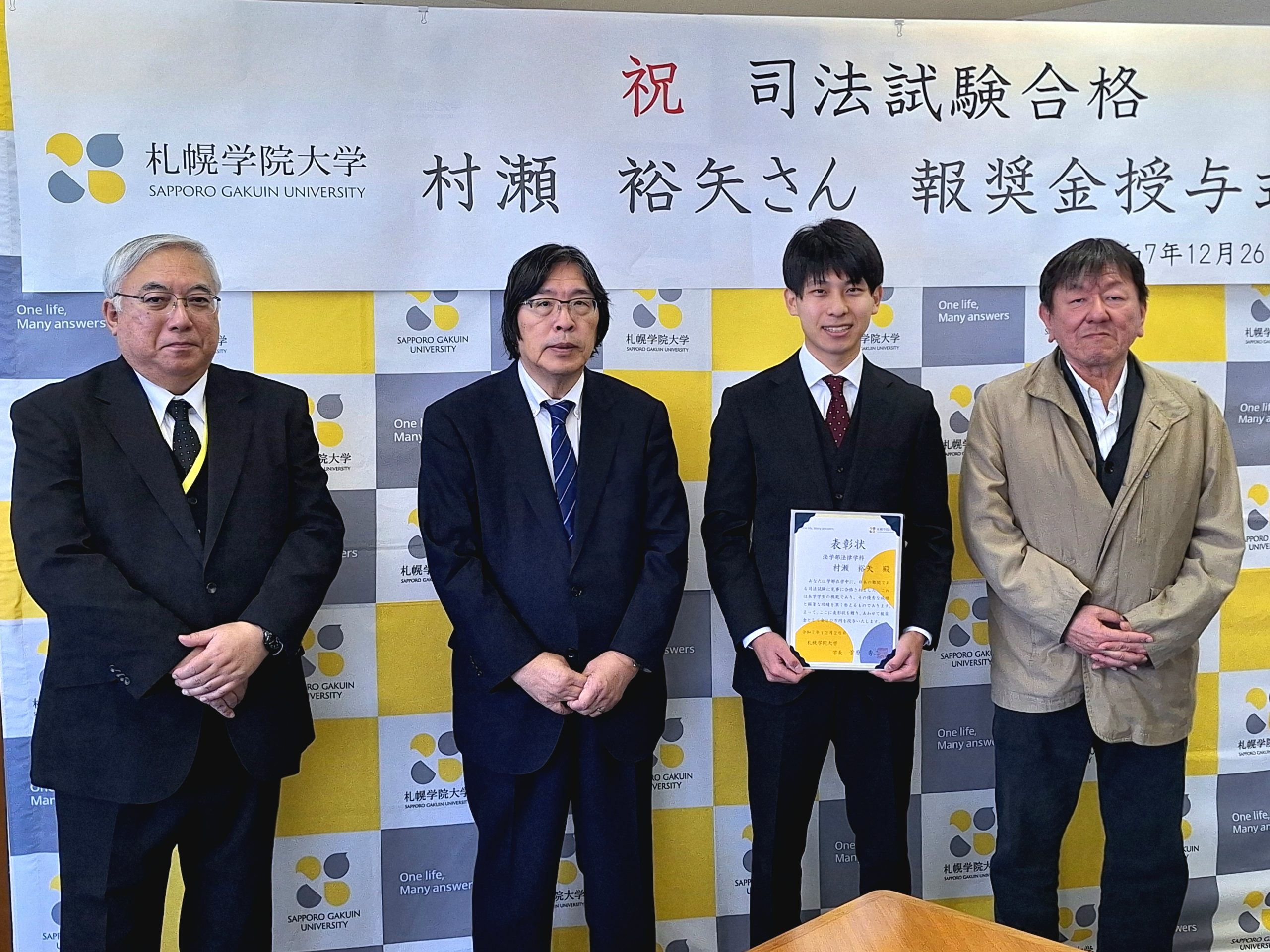 大学4年生で司法試験に合格した札幌学院大学(江別市)の村瀬裕矢さん(21)に、同大学が、表彰状と報奨金20万円を授与した。授与式は、2025年12月26日に同大学で行われ、菅原秀二学長は、「在学中の合格は、当大学で初めてのことで感銘を受けた。後輩学生への影響も非常に大きい」と述べた。(写真は、表彰状・報奨金の授与式。左から、坂口学生部長、菅原学長、村瀬さん、神谷法学部長)