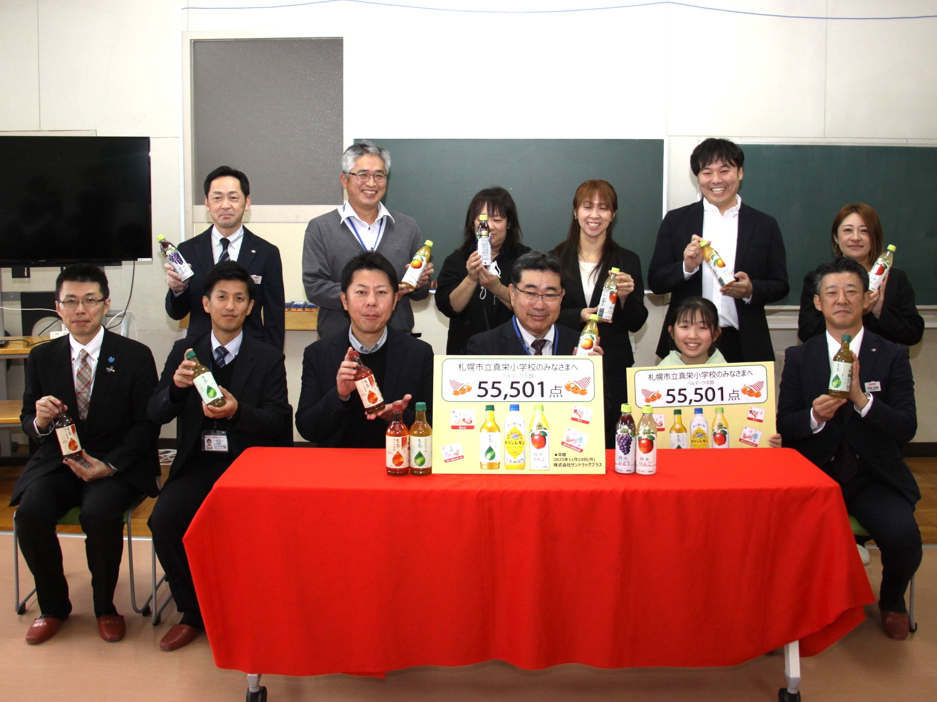 北海道キリンビバレッジ(本社・札幌市中央区)とサンドラッグプラス(同・同市東区)は2025年11月10日、道内の「サンドラッグ」店舗で実施した、キャンペーンで集まったベルマーク5万5501点を、札幌市立真栄小学校に寄贈した。同小学校は、子どもたちの教材や備品などの購入に利用する。