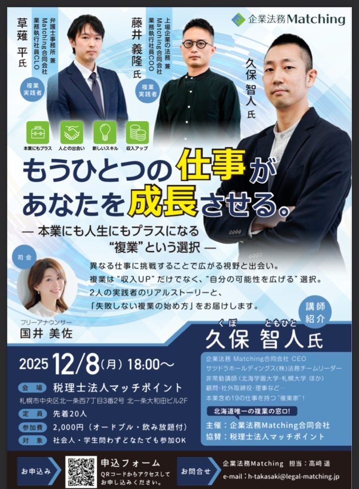 講師を務めるのは、企業法務Matching合同会社CEO、サツドラホールディングス(本社・札幌市東区)法務チームリーダーの久保智人さん。久保さんは、本業の他に、北海学園大学や札幌大学などの非常勤講師、顧問、社外取締役、理事など19の仕事を持つ複業家。セミナーの司会はフリーアナウンサーの国井美佐さんで、上場企業法務兼企業法務Matching合同会社業務執行社員COOの藤井義隆さん、弁護士事務所兼企業法務Matching合同会社業務執行社員CLOの草薙平さんも参加する。
