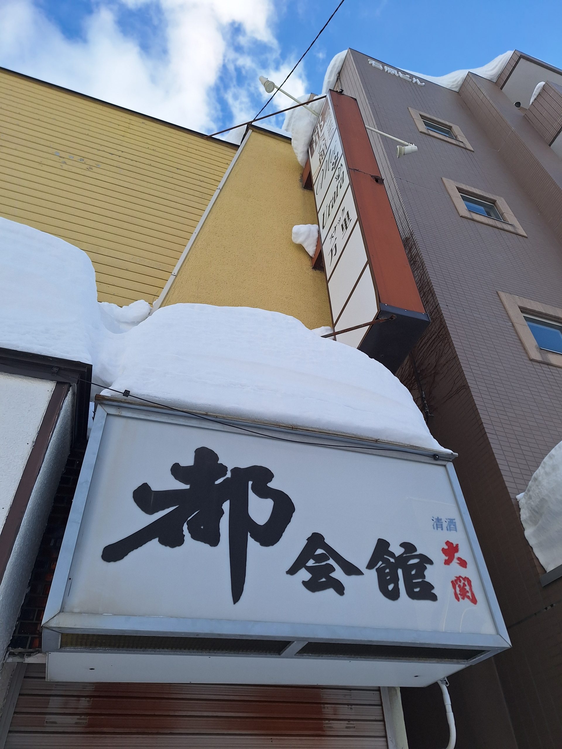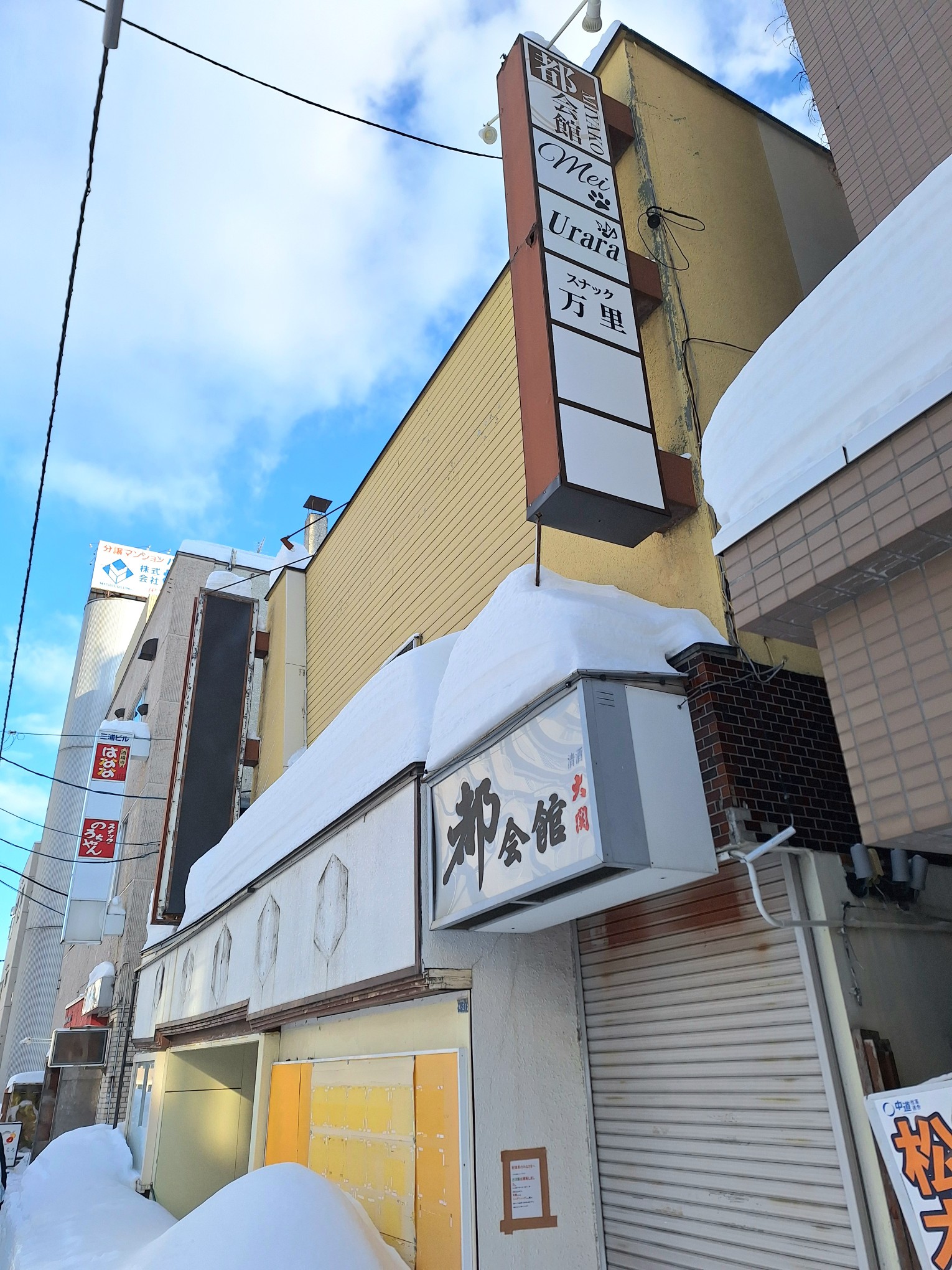 シャッターに閉ざされた建物の前には、例年になく大雪が続いた名残りで雪山ができていた。冷気が建物全体を包む中、「都会館」の看板に記された「都」の文字には、当時の勢いが、まだ宿されているようだった。